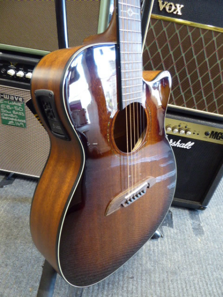 This cutaway model allows for easy access up the neck and is fitted with the LR Baggs StagePro Bronze. The StagePro Bronze is a small-footprint side-mounted EQ incorporating the renowned LR Baggs Element under-saddle pickup. This is a low-profile unit with a large backlit tuner, volume, bass and treble controls and phase. The battery box is built into the end pin jack compartment for easy access with a simple push to open and change batteries.