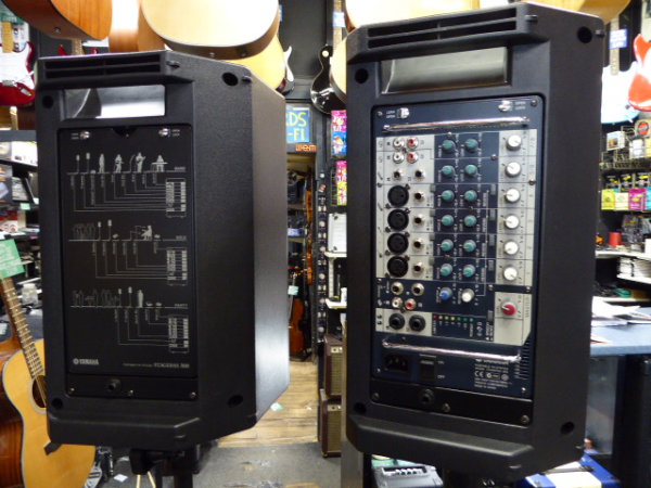 The mixer fits snugly into the back of one of the speakers.
