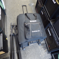Comes with a dedicated suitcase-style carry bag with wheels, and a pair of tripod stands.